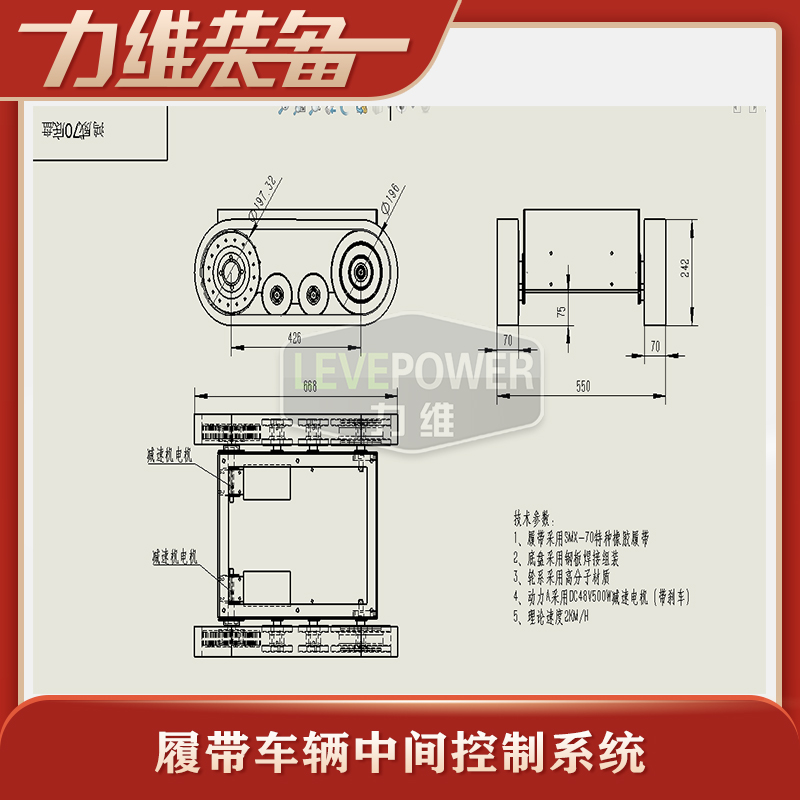 履帶底盤長668mm,履帶底盤寬550mm,履帶底盤高242mm,無線遙控履帶底盤箱體采用鋼板材質(zhì)焊接而成,防腐性能好。履帶底盤動力采用48V500W直流無刷電機,渦輪蝸桿減速機動力更強,轉(zhuǎn)彎靈活。履帶底盤電池采用48V20AH鋰電池,續(xù)航時間更長,是一款不錯的機器人橡膠履帶。