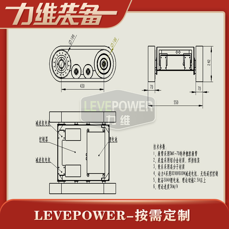 LEVE-XND-70特種橡膠履帶底盤采用天橡膠內加凱夫拉纖維經過高溫硫化擠壓成型,材質輕、耐磨性能強,是一款不錯機器人橡膠履帶。