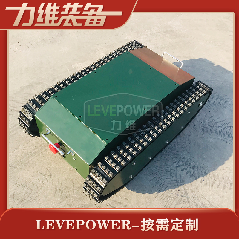 特種橡膠履帶底盤長(zhǎng)1086mm,履帶底盤寬650mm,履帶底盤高382mm,無(wú)線遙履帶底盤搭載48V1500W直流無(wú)刷電機(jī),RV50渦輪蝸桿減速機(jī),動(dòng)力更強(qiáng)。履帶底盤采用48V100AH鋰電池,續(xù)航時(shí)間90分鐘。履帶底盤框架采用鋼板箱體焊接而成,底盤承載力大,是一款全地形履帶底盤。