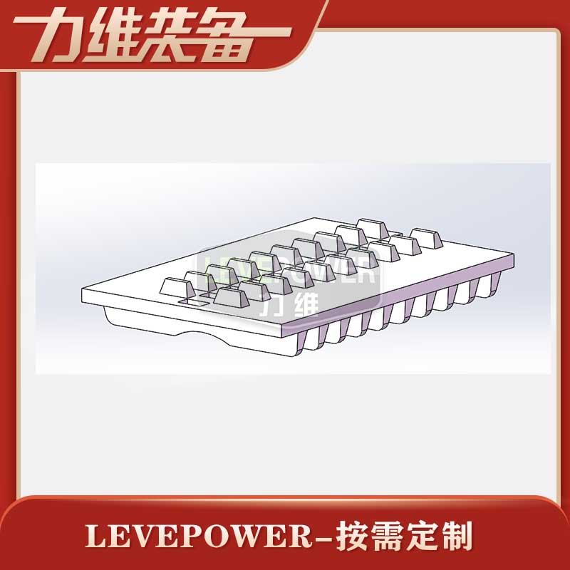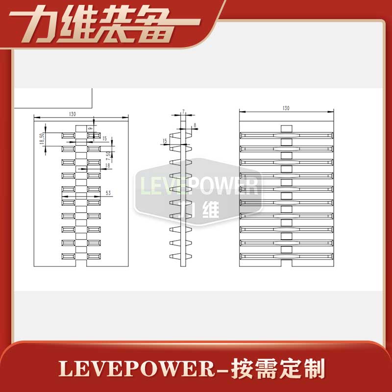 此履帶為插齒履帶,外花紋采用波浪細(xì)橫紋花紋,內(nèi)齒采用細(xì)三角長(zhǎng)條設(shè)計(jì),節(jié)距較密,履帶內(nèi)置細(xì)長(zhǎng)條鋼骨架,可提高載重量,是一款