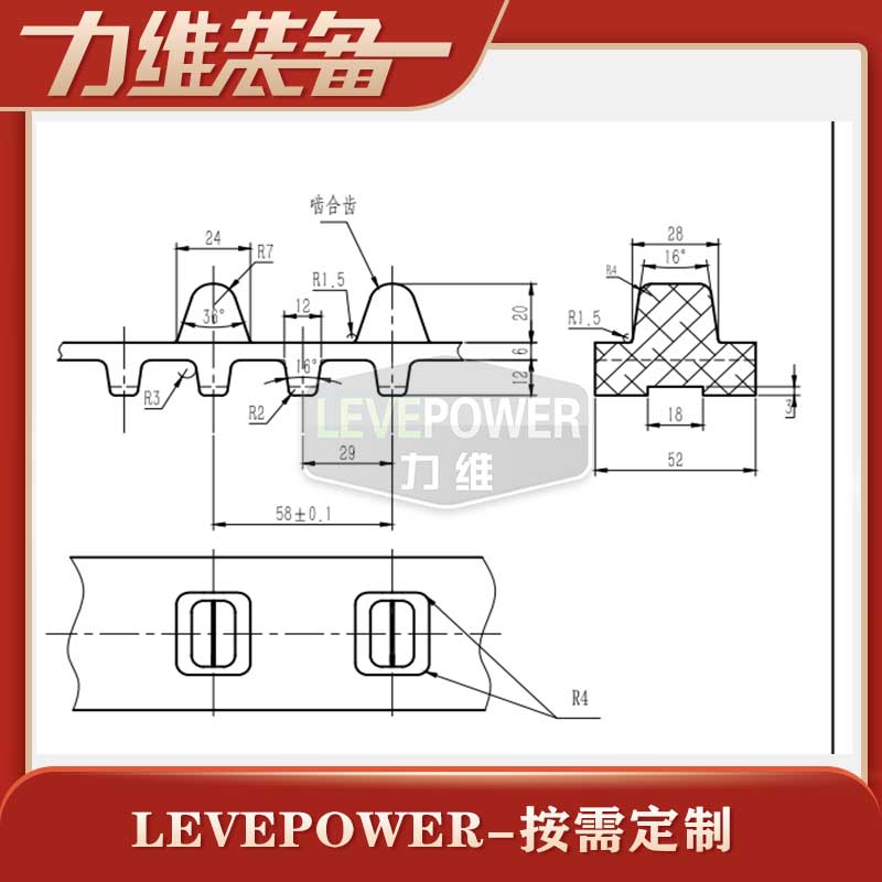 此履帶為撥齒履帶,外花紋采用矩形橫紋設計,內齒采用節距適中的三角塊狀設計,帶體較厚,此款設計提高了履帶自身的載重能力,和抓地力是一款適合用于機器人底盤的配套履帶。