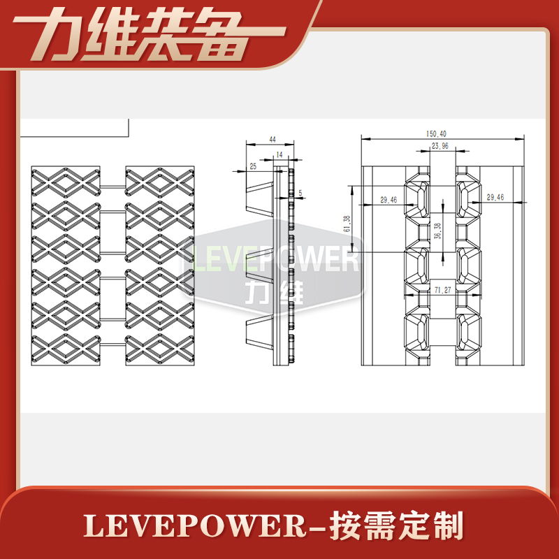 此款特種履帶采用網狀外花紋設計,外花紋設計非常低,大限度的增大接地面積。在柏油路,廠區地面,地板磚等上使用格外平穩,大大地控制了底盤行走時的顛簸性。