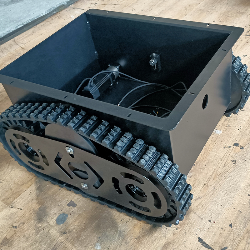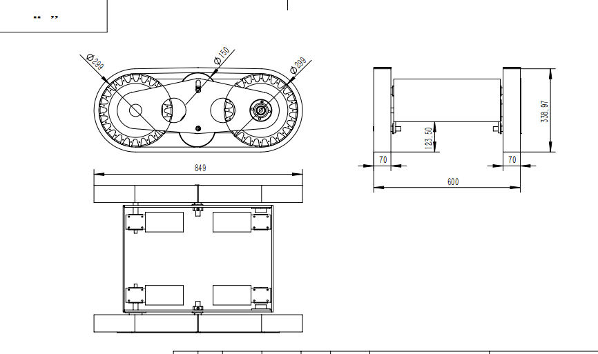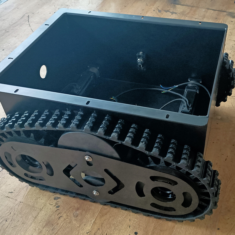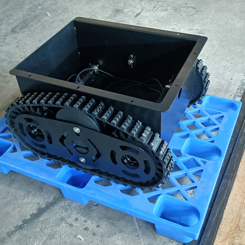橡膠履帶底盤長849mm,履帶底盤寬600mm,履帶底盤高338mm,無線遙控履帶底盤搭載48V500W直流永磁無刷電機,RV渦輪蝸桿減速機動力更強,爬坡更有勁。